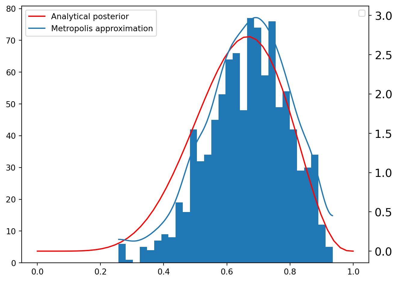 p[i] = p[i - 1]The resulting sampling distribution can be visualized alongside its estimated density and the analytical posterior.