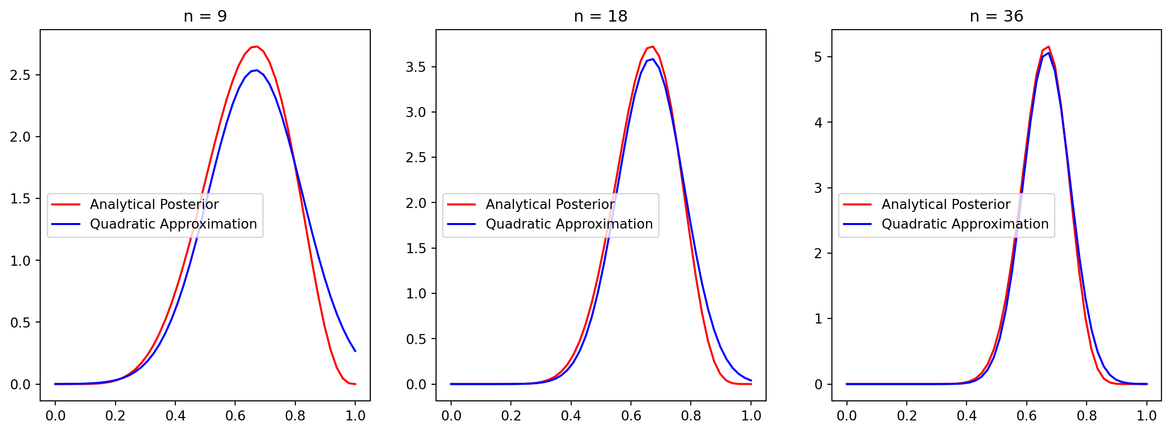 This Gaussian approximation is known as quadratic approximation because the logarithm of a normal distribution is a parabola. Quadratic approximation is also referred to as: