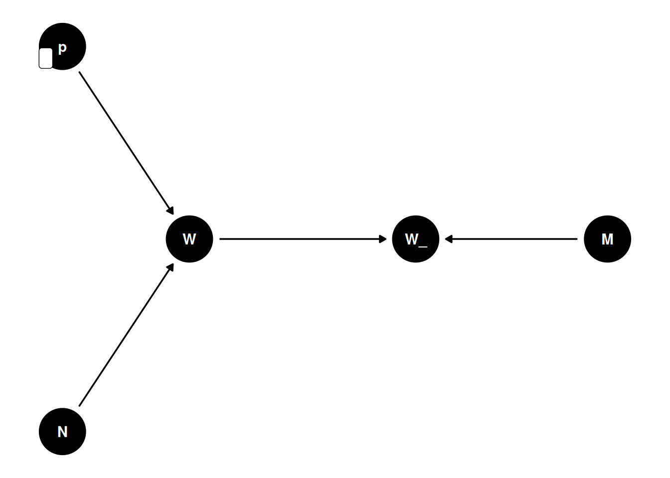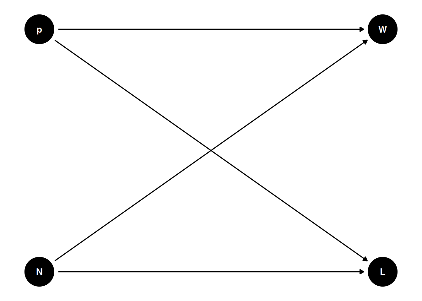 Here, N represents the number of times a globe is tossed, with W being the number of times the globe is caught with your finger on water, and L being the catches on land. p represents the proportion of the earth’s surface covered by water.