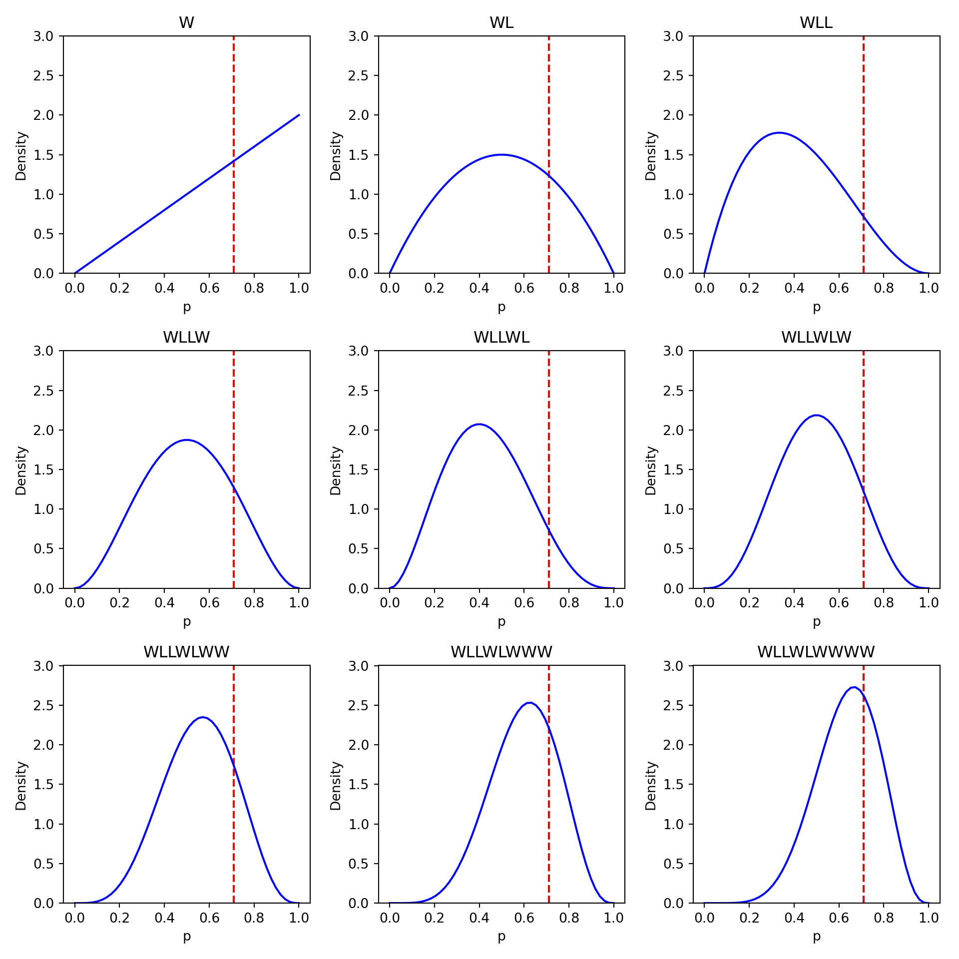 axes[i - 1].plot(x, st.beta.pdf(x, W + 1, L + 1), "b-");
