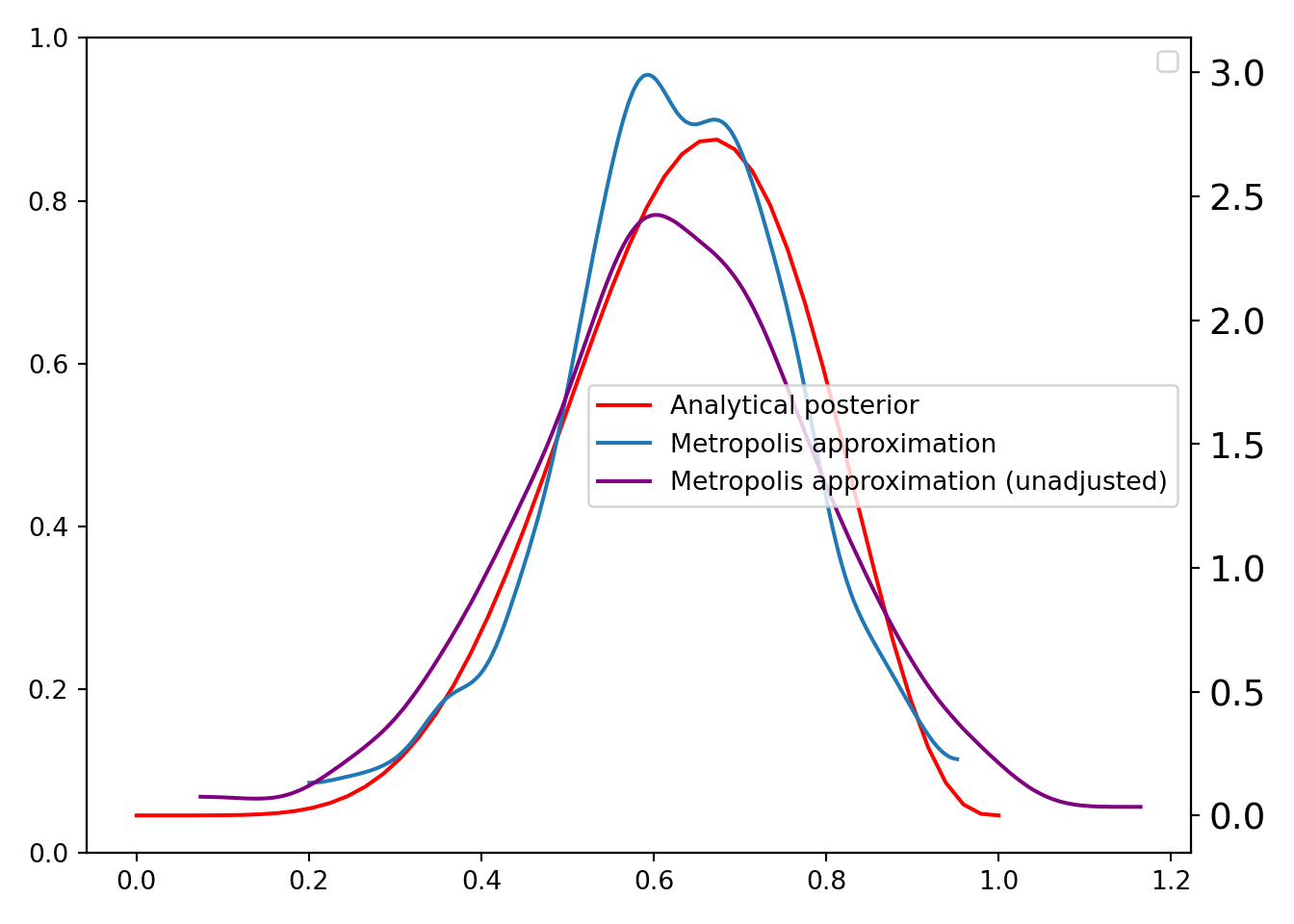 This plot compares the density estimates for the unadjusted posterior, alongside the “misclassification”-adjusted posterior. Notice the increased resemblance to the analytical posterior and the increased steepness of the adjusted posterior - more precision around the parameter!